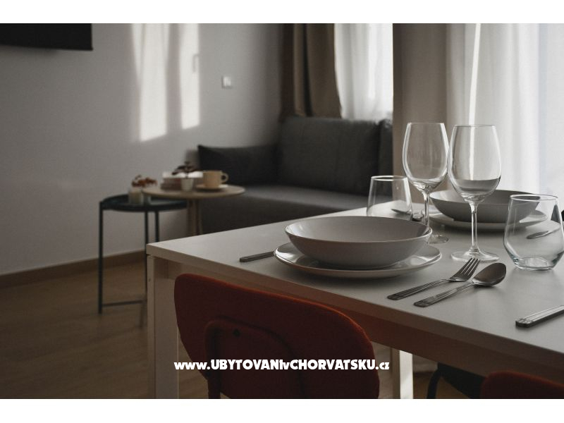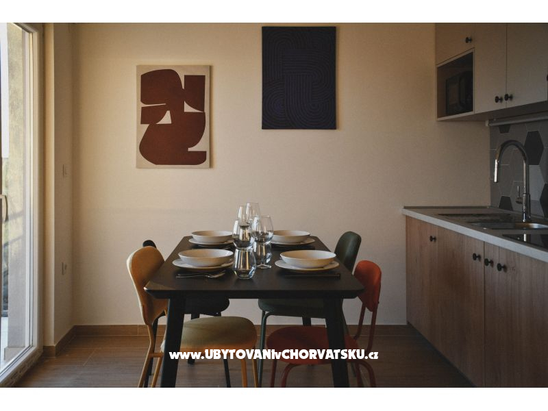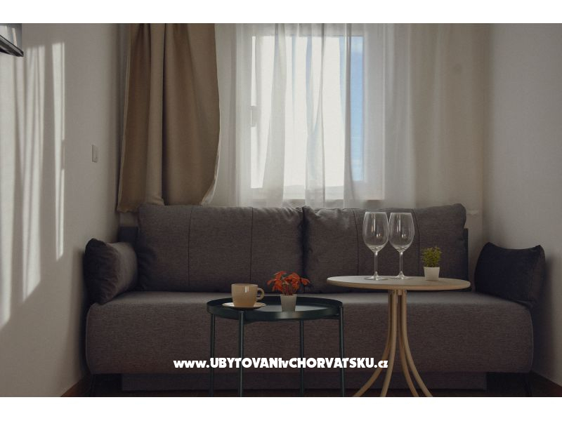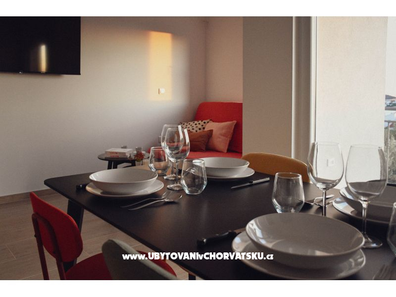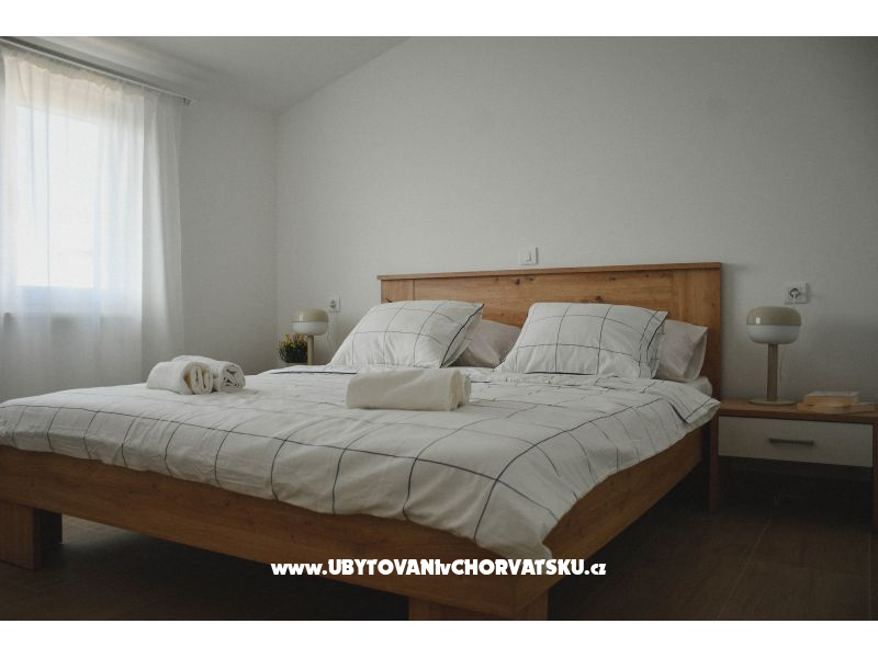 Apartmány jsou moderně a komfortně zařízené a plně vybavené pro bezstarostný pobyt. Každý apartmán pro 2+2 osoby má plně vybavenou kuchyň (lednice, varná deska, nádobí a kuchyňské potřeby), funkční koupelnu, světlou ložnici a pohodlný obývací pokoj s přistýlkou. Hostům je k dispozici bezplatné Wi-Fi, televize, soukromé parkování a venkovní gril – ideální pro letní večery.