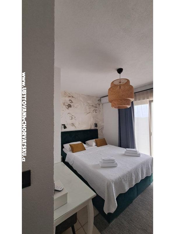 Apartmány jsou situovány v klidné části města, byt s balkonem s výhledem na moře a celé město. Pláž je asi 100m od domu. Check in 14h, Check out do 10h