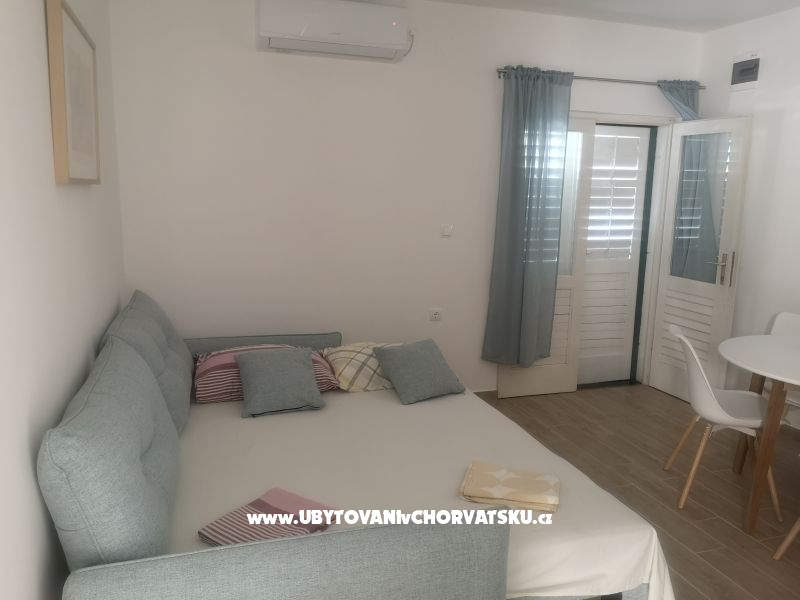 "Ap.1" - Apartmani prvi red do mora, klimatizirano, privatna plaža prikladna za djecu, ležaljke dostupne. U dvorištu je veliki roštilj. Parking je odmah pokraj apartmana i ima 8 parkirnih mjesta.